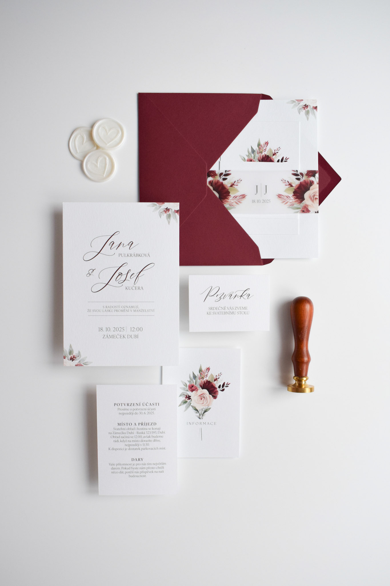 Jana a Josef mi pro své svatební oznámení dali volnou ruku. Podle barev svatby jsem tedy vytvořila celý svatební komplet. Oznámení, informační kartičku, pozvánku ke stolu a celé to spojuje transparentní proužek. Obálku jsme zvolili v barvě Carmine a k nim pečetě v barvě Pearl white s motivem srdíčka.