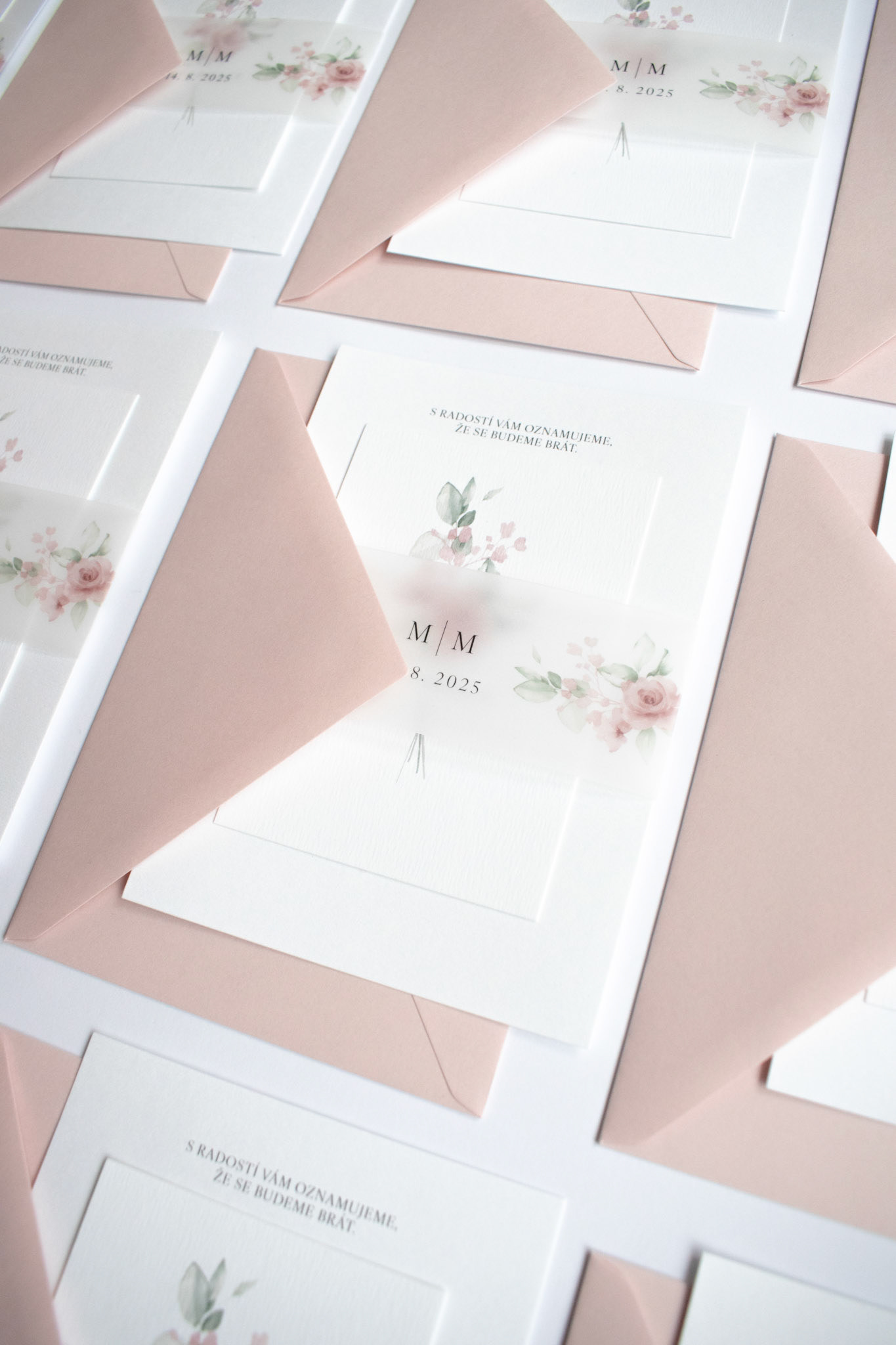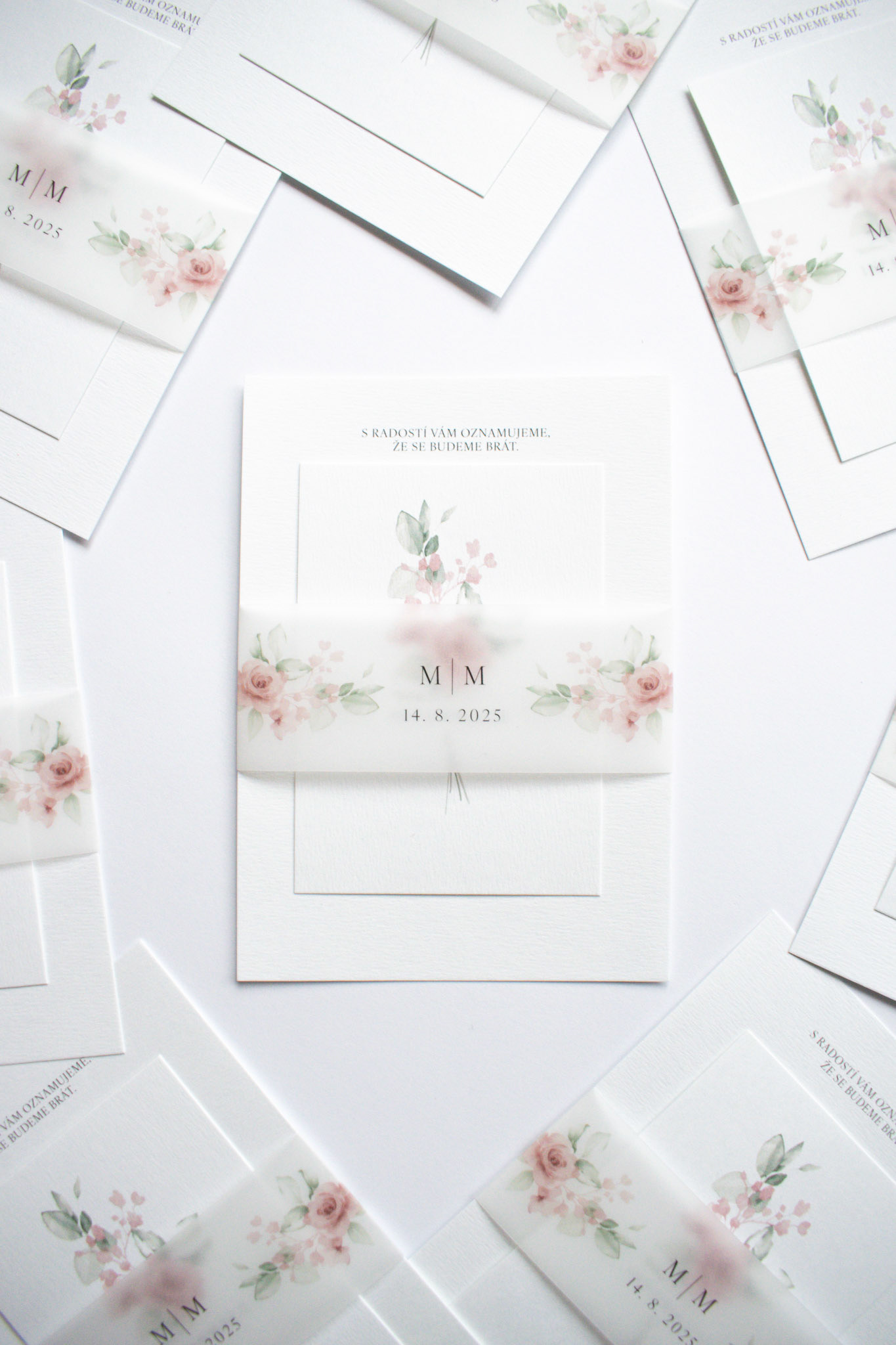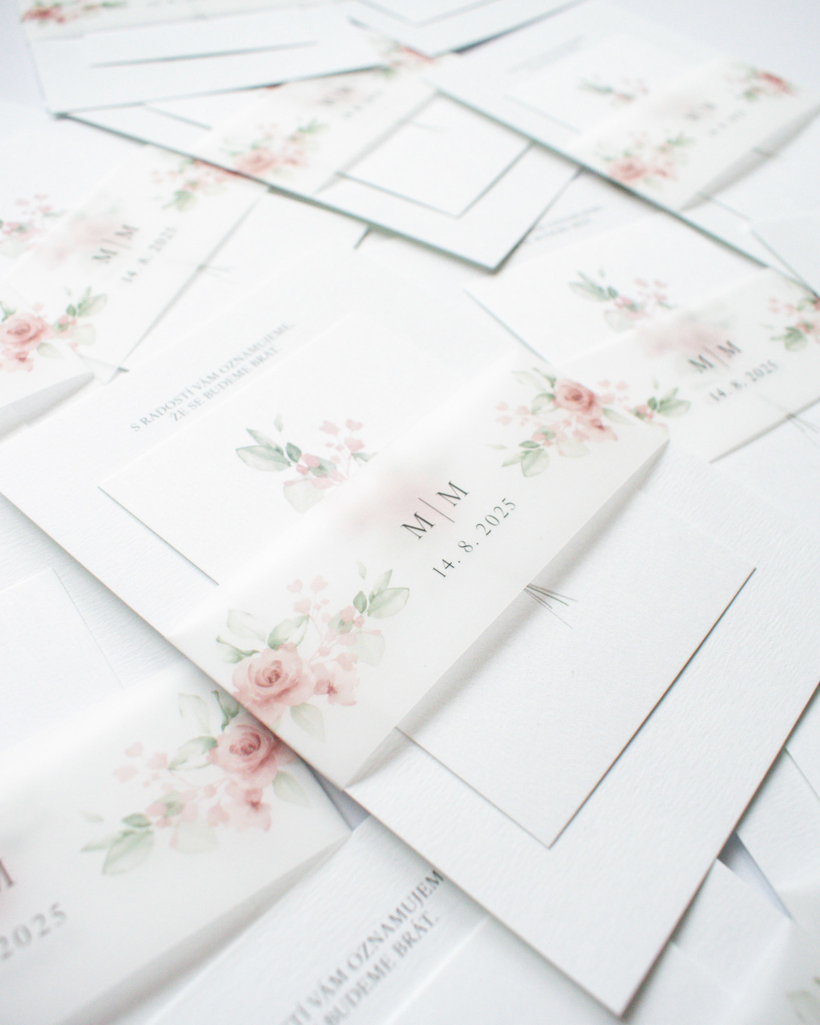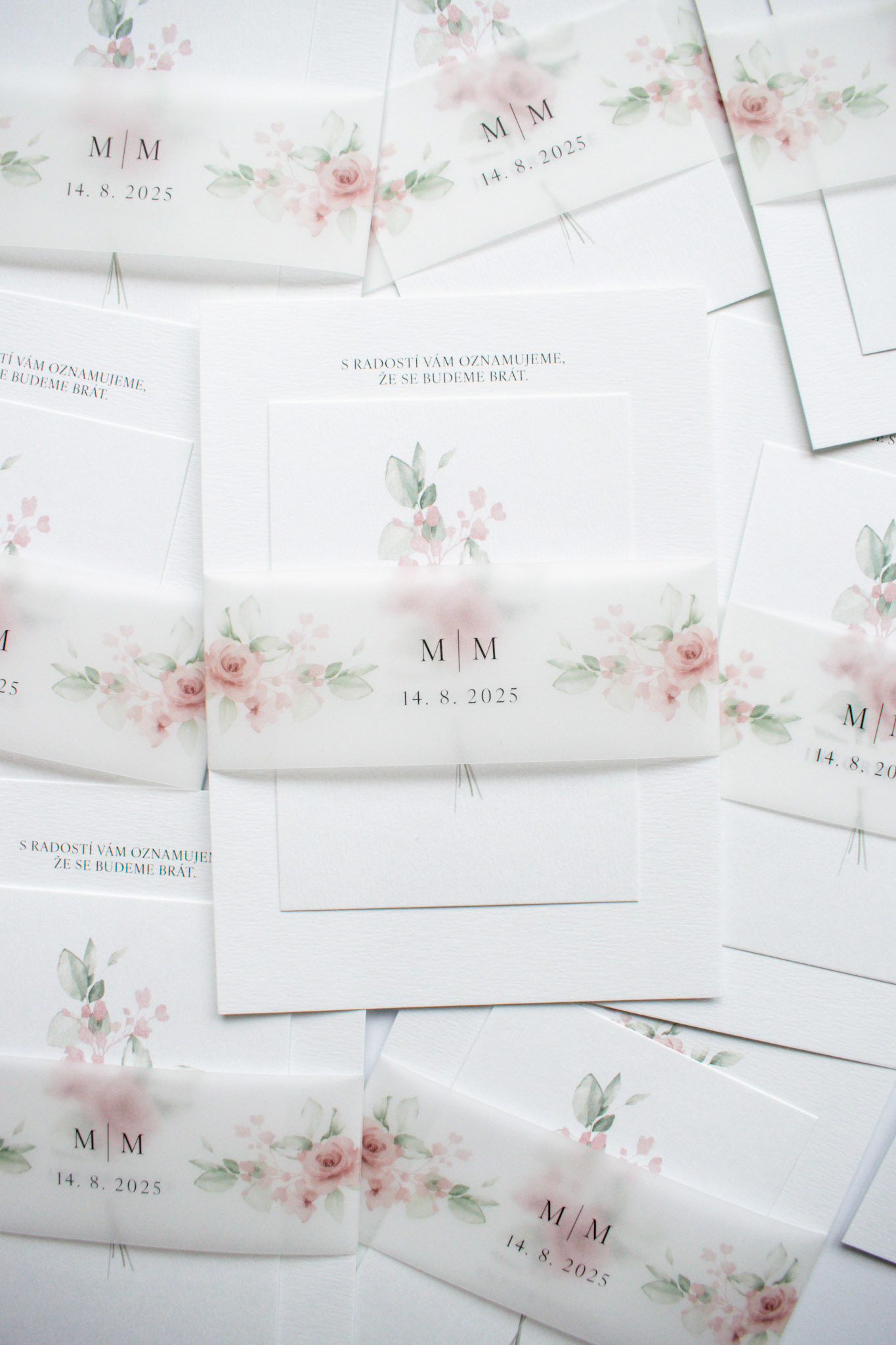 Svatební komplet pro Marii a Marka s jemnou ilustrací květin. Obsahuje oznámení, informační kartičku a transparentní proužek.