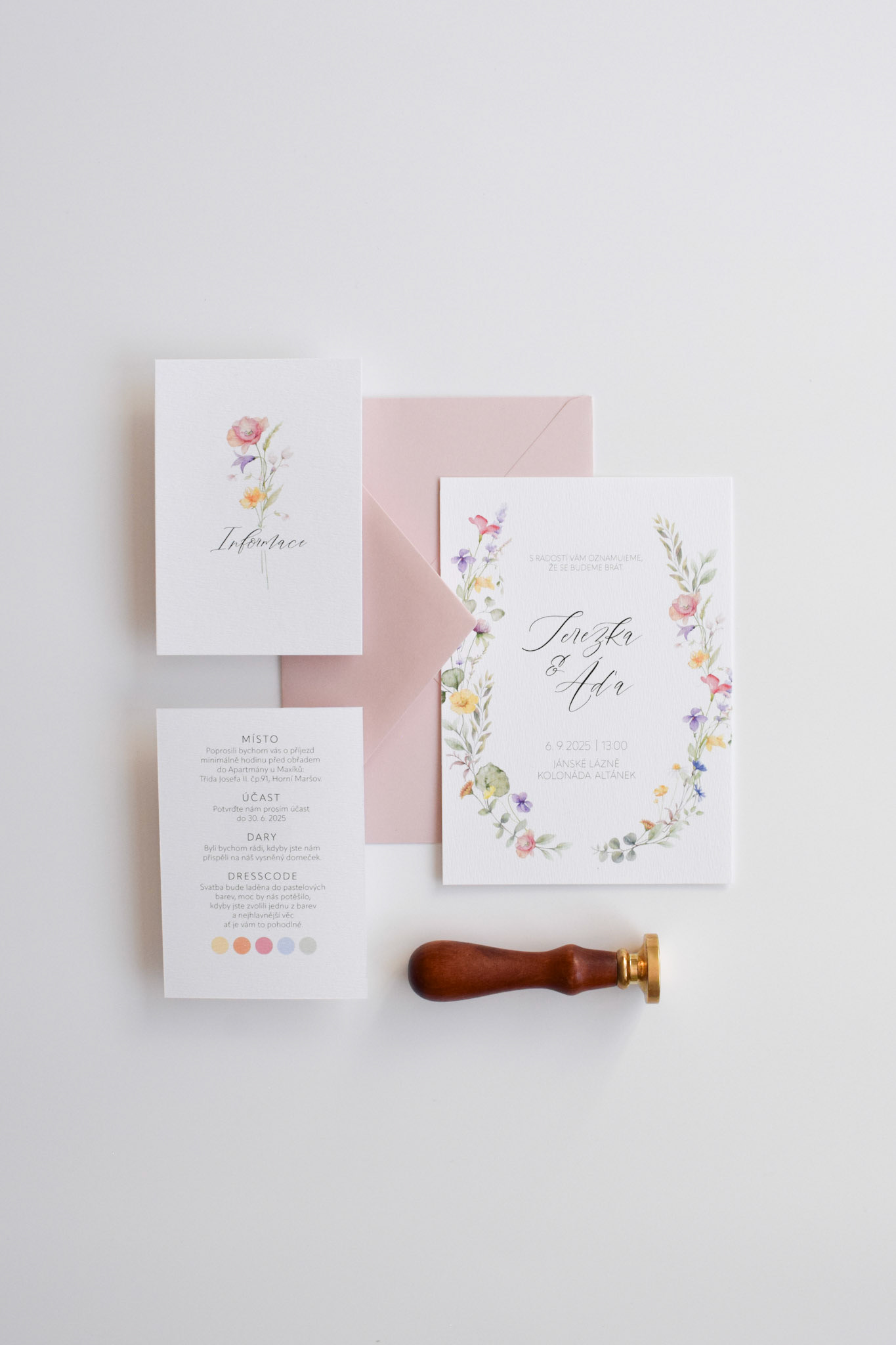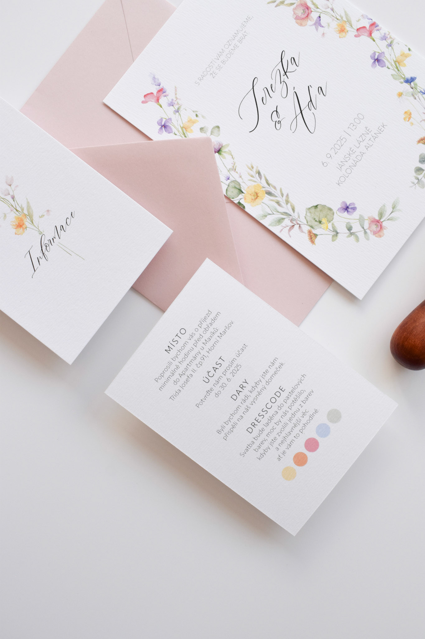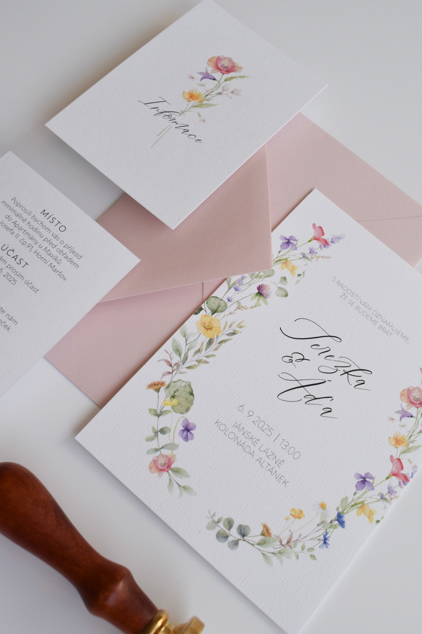 Terezka a Áďa si přáli svatební oznámení s barevným lučním kvítím a psaným písmem. Kromě oznámení si nechali vytvořit také informační kartičku.