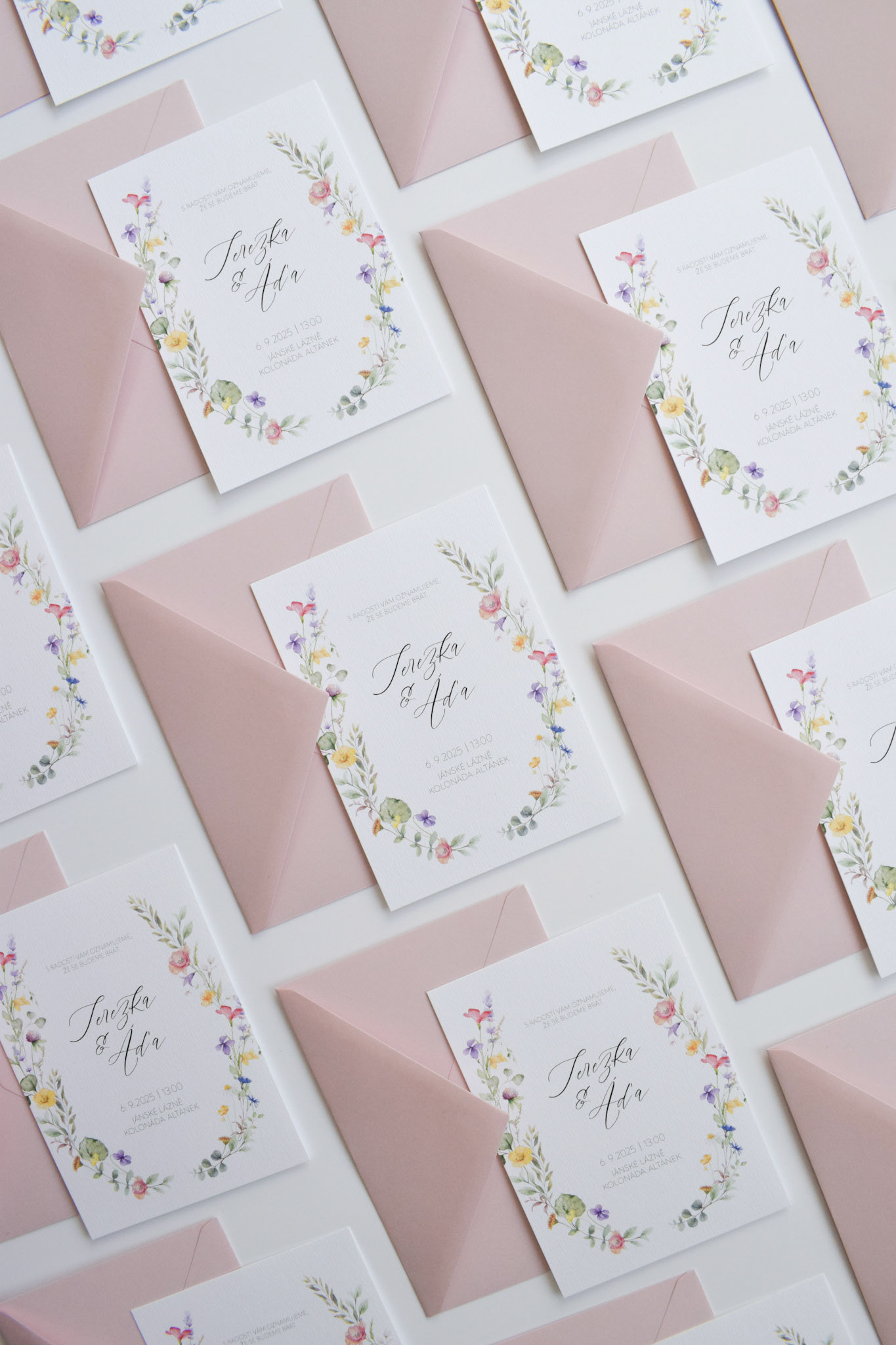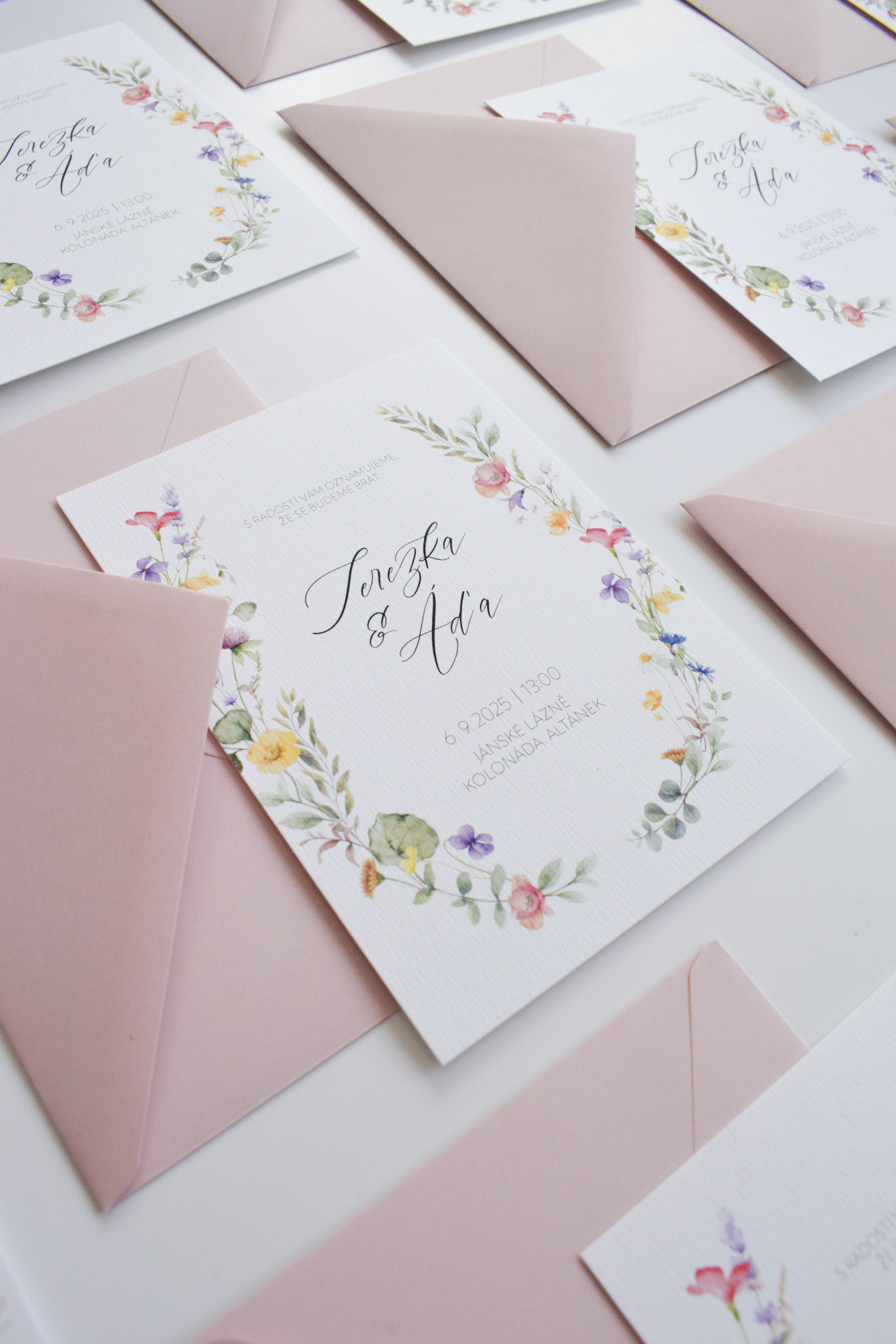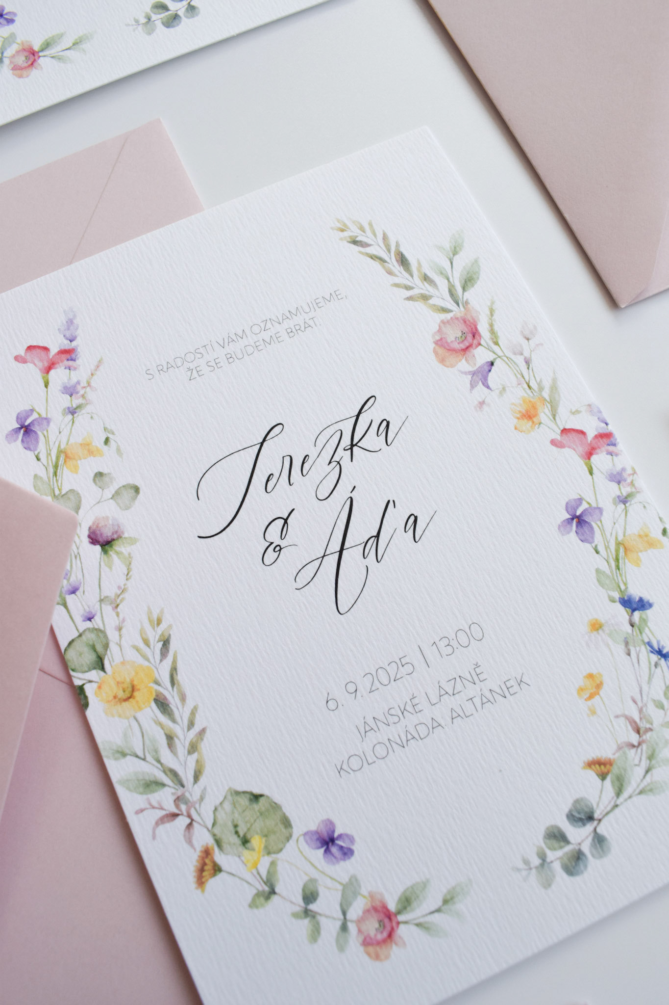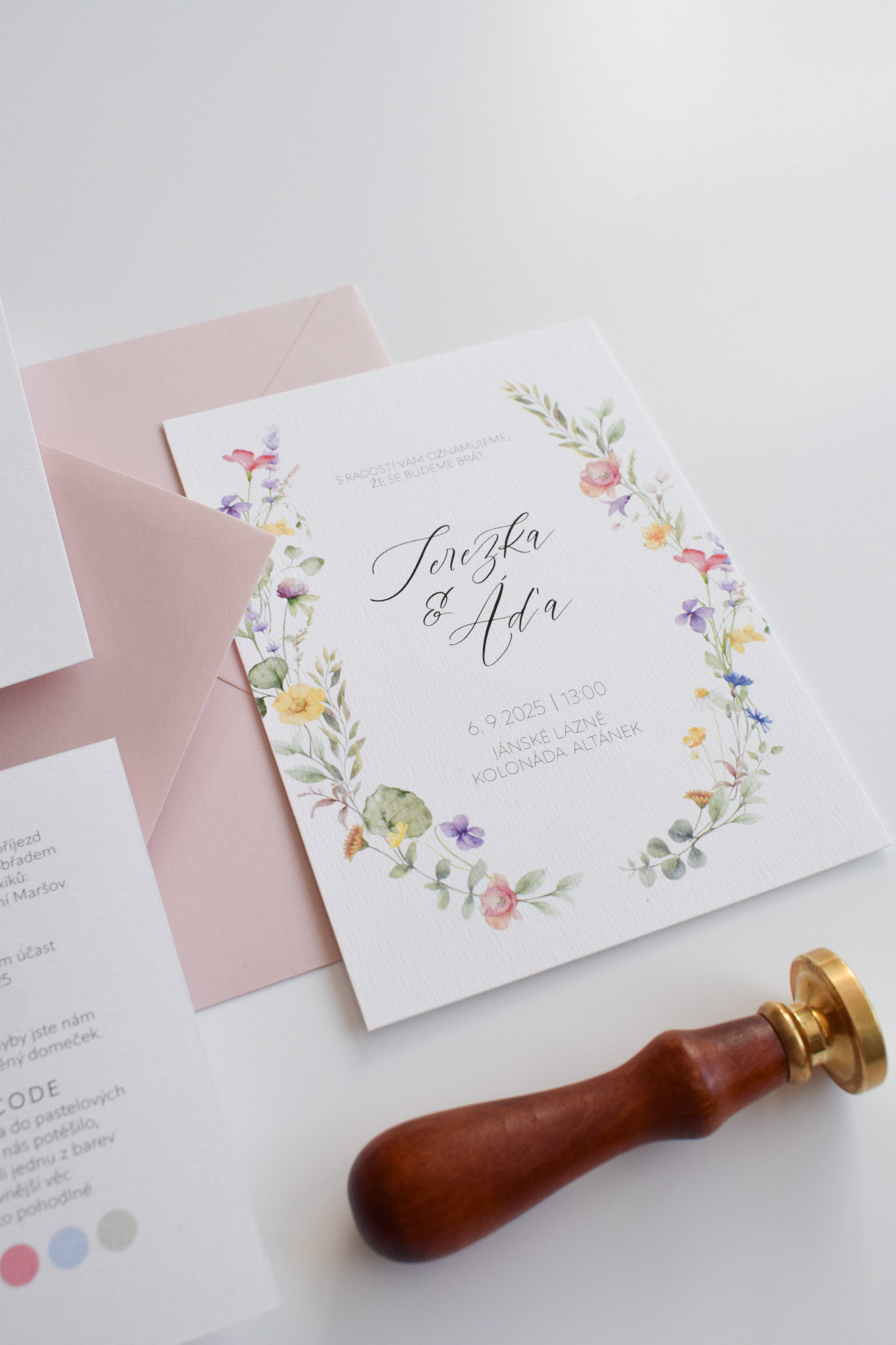 Terezka a Áďa si přáli svatební oznámení s barevným lučním kvítím a psaným písmem. Kromě oznámení si nechali vytvořit také informační kartičku.