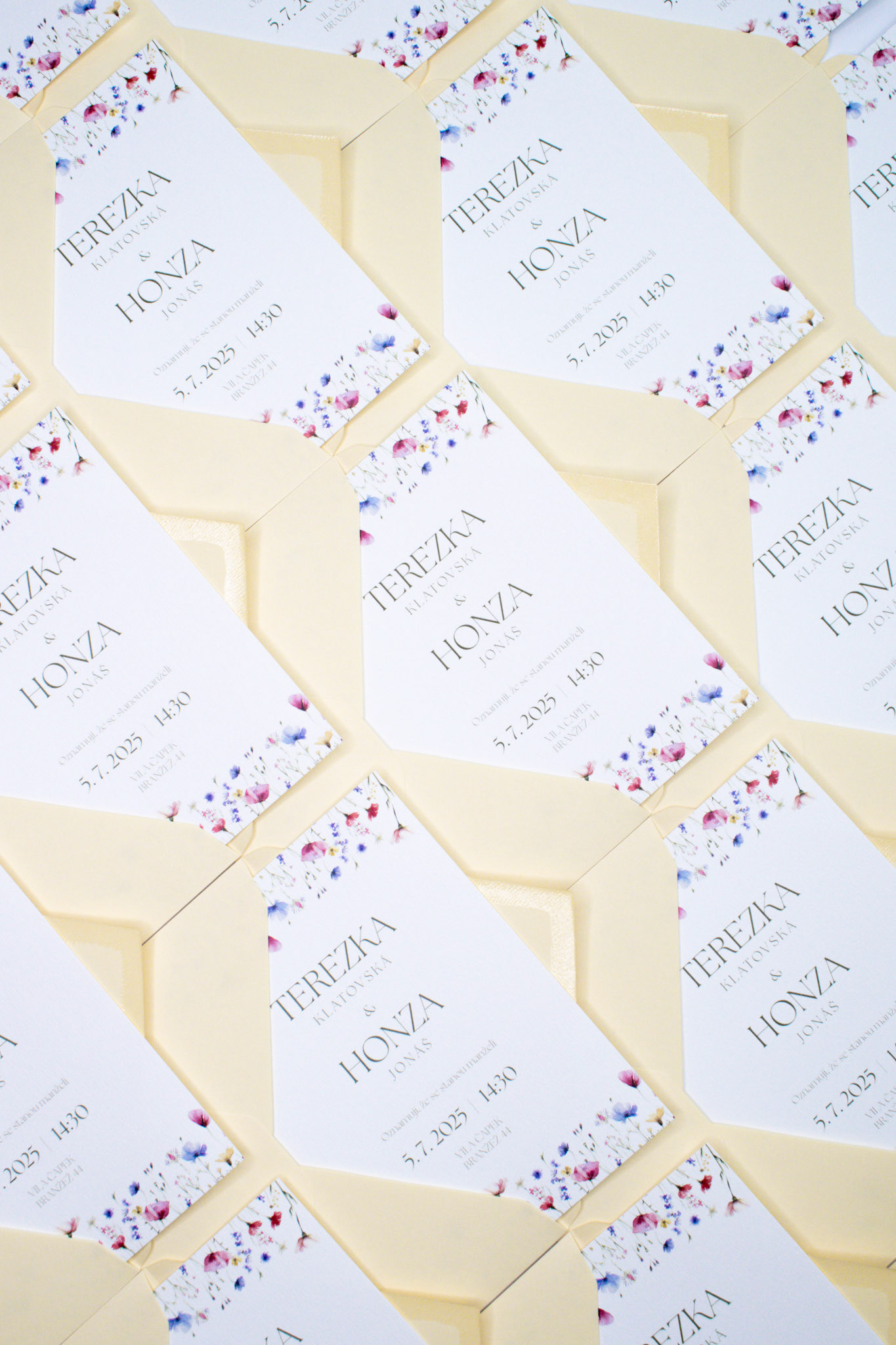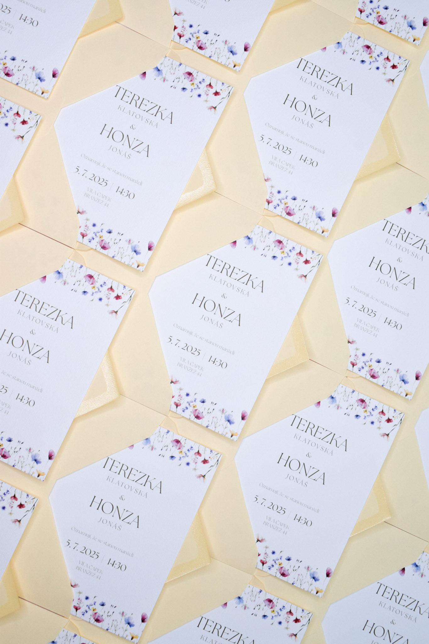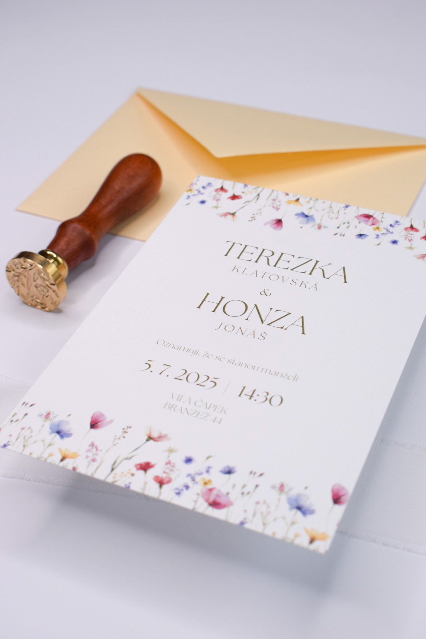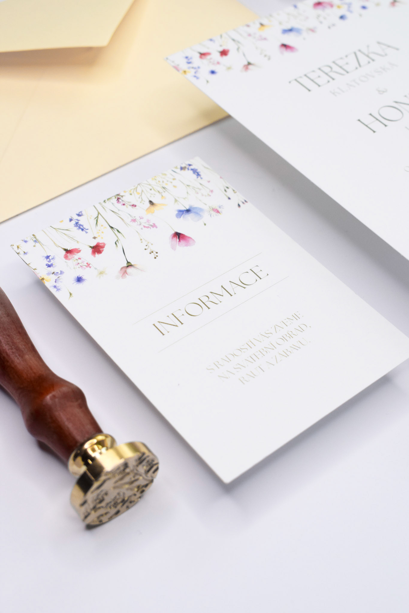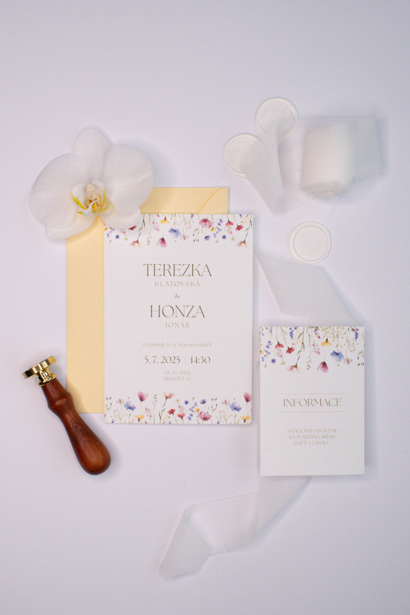 Svatební oznámení a informační kartička pro Terezku a Honzu, s jemnou ilustrací lučních květin.